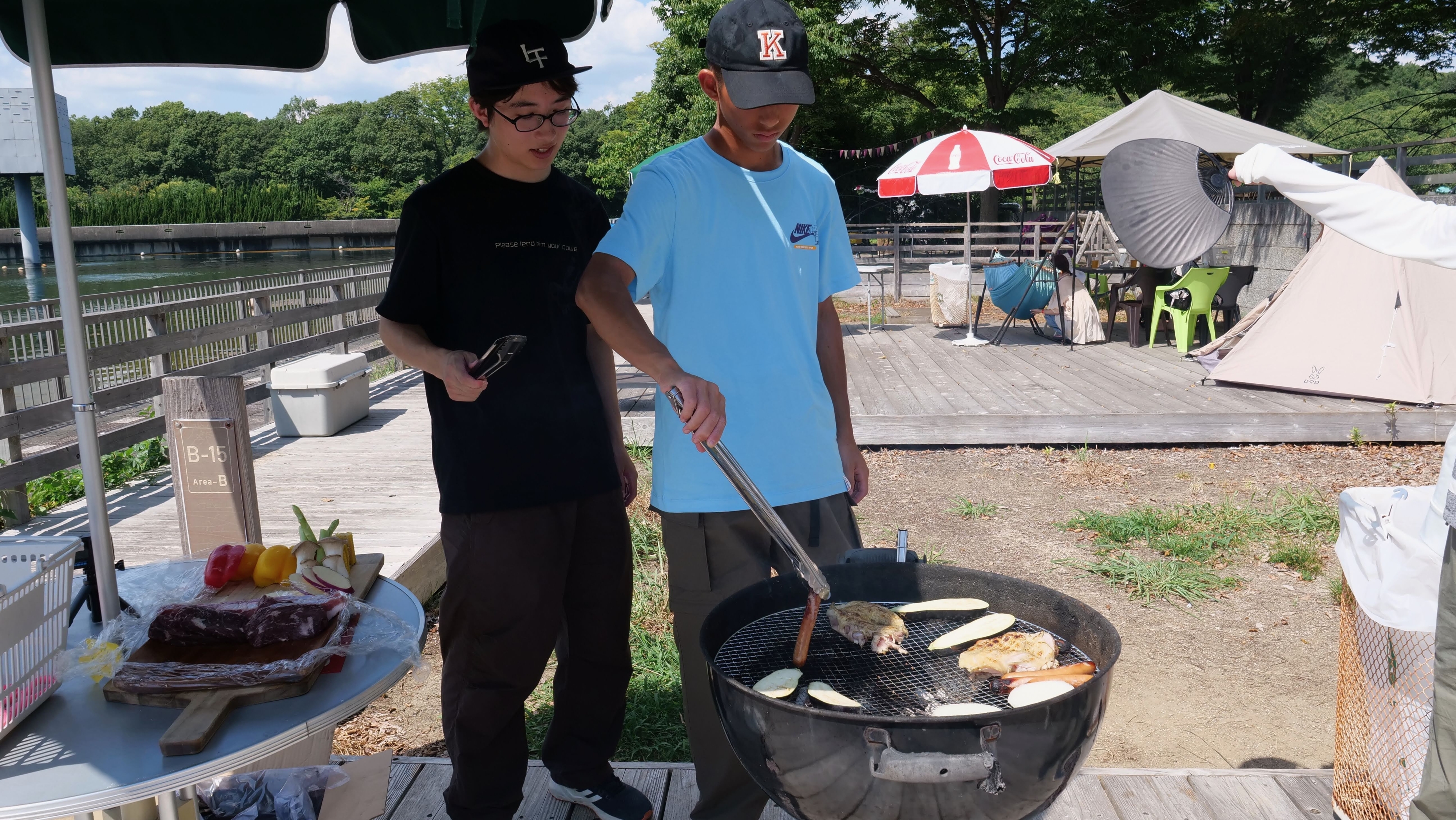足漕ぎのボートの池のところで、BBQエリアもあり、めちゃめちゃいい匂いがしていたので、ふらりと立ち寄ったところ、当日の受付もOKだったので、14時からグランピングエリアを予約。灼熱の太陽の下でのBBQとなり、めちゃめちゃ暑かったですが、いい思い出と鳴りました。肉を焼いている長男と次男の姿を見ると、すっかり大人です。